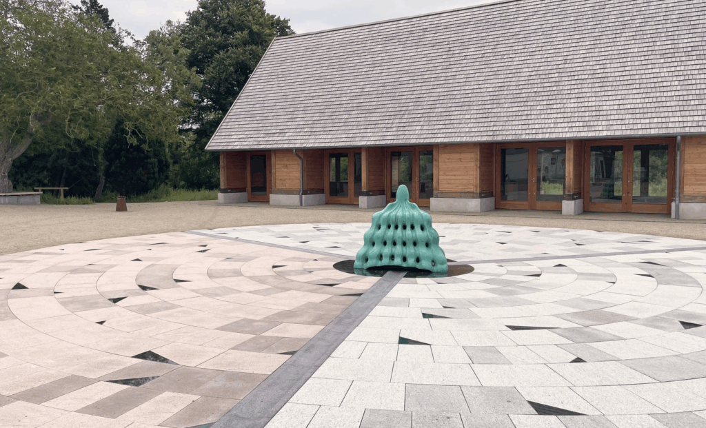 Smukt byggeri, der danner et nyt centrum i landsbyen. Med Bjørn Nørgaards skulptur og belægning Freyrs Brønd.